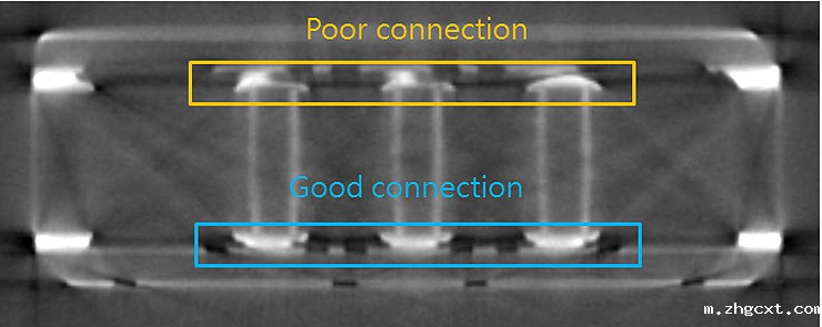我们了解到这是包装不良的结果。由于封装后的尺寸较大,因此可以通过“无损技术分析”轻松识别缺陷。建议通过3D-X射线CT检查来发现这种“关节连接不良”。
