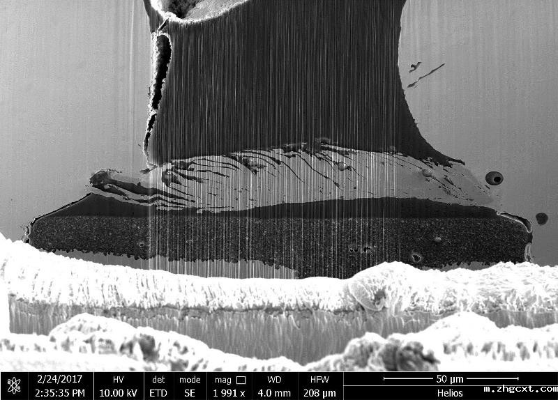 3D 设备通过对齐包装材料 (BOM) 承受更大的应力。它需要低压工具,因为当施加外力时,相邻层往往会断裂。由于传统手工磨削的应力可能导致严重损坏,因此使用低应力等离子体FIB切割出失效部分以识别原因。结果:元件的焊球之间存在 RDL 桥接(见下图)。