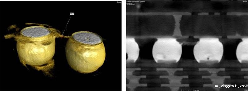 通过故障点处热辐射的相位差检测 3D 封装的故障深度(Z 轴方向),而不会损坏受电的 3D 设备,从而快速定位故障点(获取其 XYZ 坐标),进而得出缺陷落在焊球处的结论(见下图)。