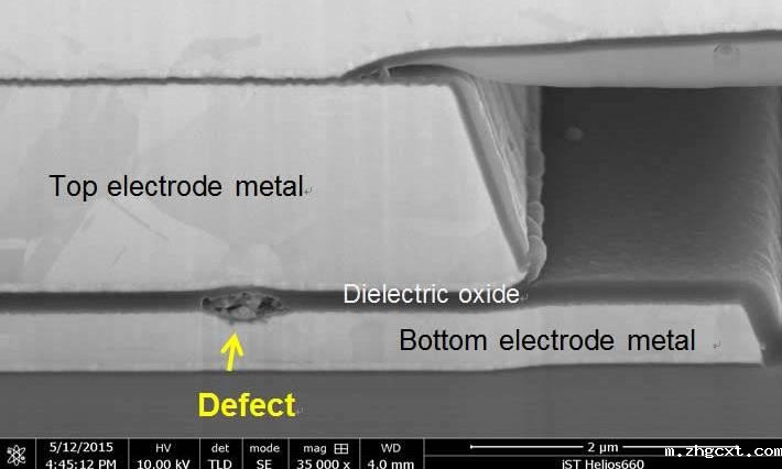 (2) 双光束FIB切片(图2-2)立即揭示介电氧化物层的缺陷!烧坏的绝缘层导致顶部和底部电极金属泄漏。